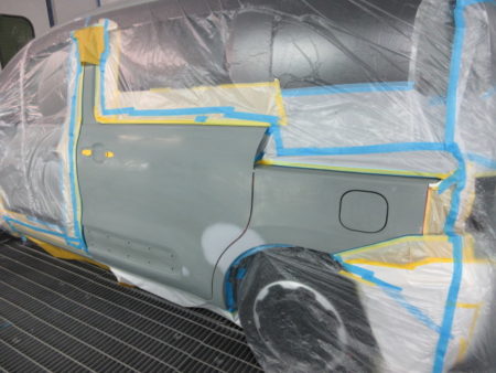 塗装の前に、塗装面の足付けと塗装面の油汚れやワックス分をしっかり落とす脱脂を行い、塗装面以外を塗料の飛散による汚れを防止する為に専用のシートでマスキングを行います。
