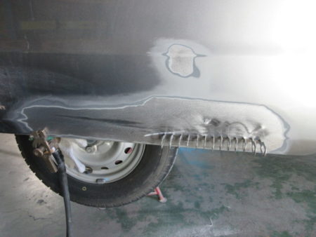 ドアとロッカーパネルは裏側から叩き出して凹みを修正することが出来ないのでスタッド溶接でピンを複数溶接して専用の治具を取付けて、引き出して凹みの修正をします。