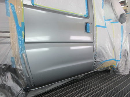 ベテランの塗装職人により現車の色に合わせた調色をし、一度にべったり塗装せず数回に分けて塗料を馴染ませながらサフェーサが完全に隠蔽されていることを確認しながら塗装を行って行きます。