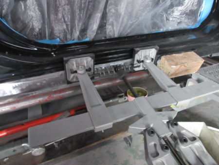 ▼ ロッカーパネルの凹み部分をサンディングで削って地肌を出し、スタッド溶接で多くのピンを溶接して専用の治具を用いて引き出して修正をかけます。