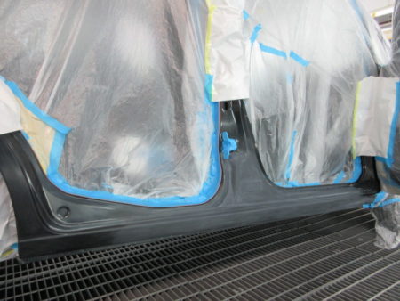 さらに脂分・ワックス分を専用の溶剤で落とす脱脂の作業と併せて塗料の食いつきを良くするためのけ足付も行います。今回の塗装色はブルーイッシュブラックパール(色番号 ZJ3)となります。