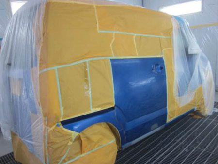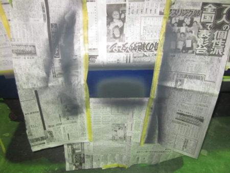 ▼その後、下地処理剤のサフェーサーを塗布したところです。スプレーガンで吹き付けますので、周辺はマスキングします。