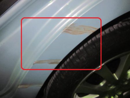 ▼ フェンダー部分の傷は上部の方は擦り傷程度ですが下部に行くにしたがってへこみが深くなっています。