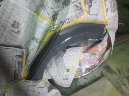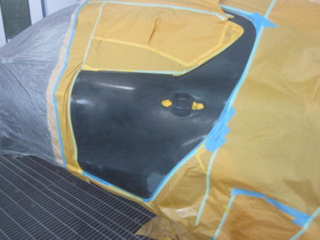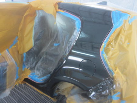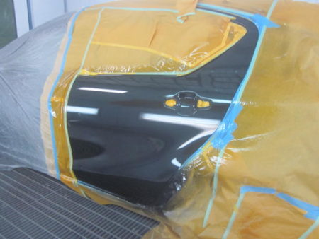 ▼ リアドアの塗装の前にマスキングテープやマスキングペーパーで塗装が飛ばないようにしっかりと室内や保護すべき個所に覆いをします。