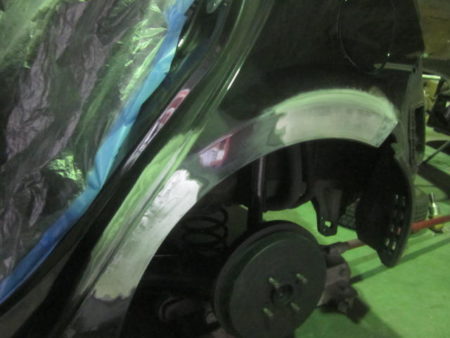 ▼ リアドアのキズはサンディングで削り、パテ修正をしました。