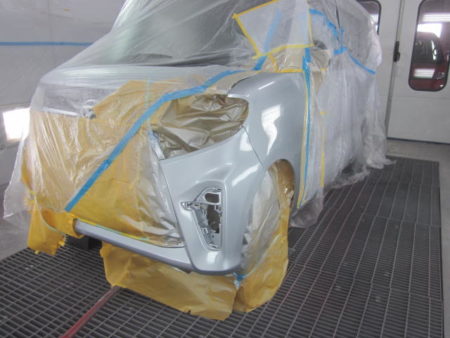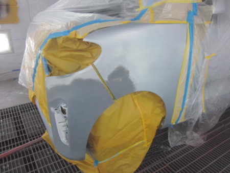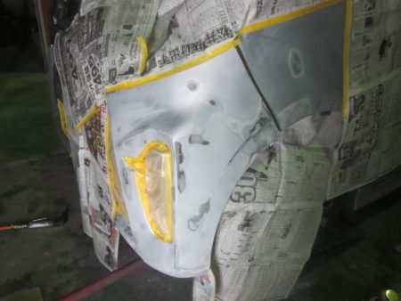 車を塗装専用ブースに移動してこれから塗装を行って行きますが、下地処理としてのサフェーサを塗布します。