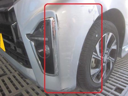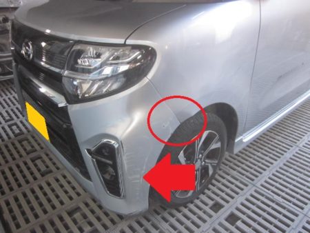 ▼ フロントバンパーとフェンダーの間が押されて凹んでしまっています。