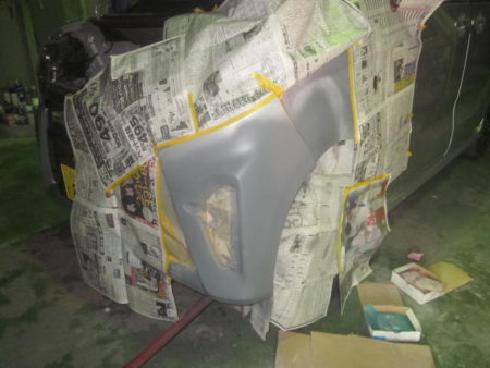 ▼ 出来るだけ予算を抑えたいとの事でしたのでフロントバンパーは取り外さずそのままで修理を行って行きます。