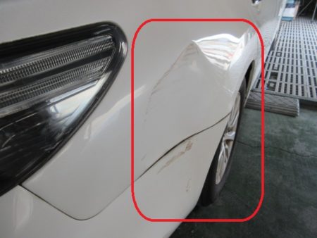 ▼ クオターパネルの凹み傷が結構酷い状態ですね。そこは鈑金修理で綺麗に直していきます。