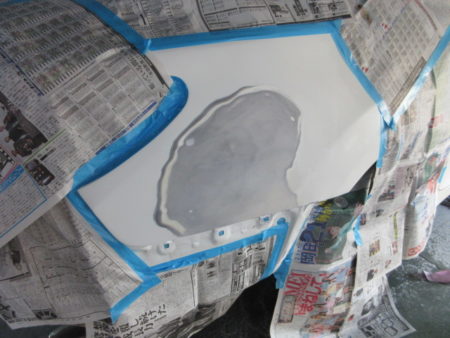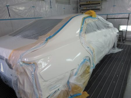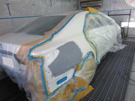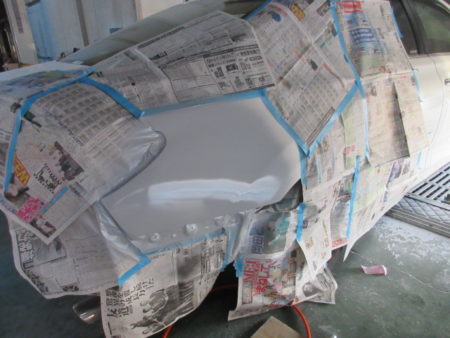 塗装面の足付けと塗装面の油汚れやワックス分をしっかり落とす脱脂を行い、塗装面以外を塗料の飛散による汚れを防止する為に専用のシートでマスキングを行います。