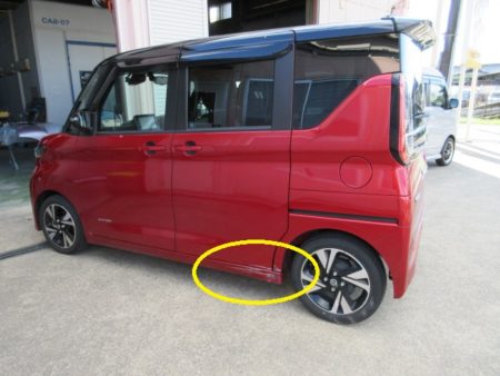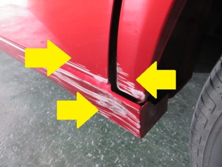 ▼ ロッカーパネルプロテクターが結構凹んでしまっています。クオーターパネルまで傷がついてしまっている状態です。