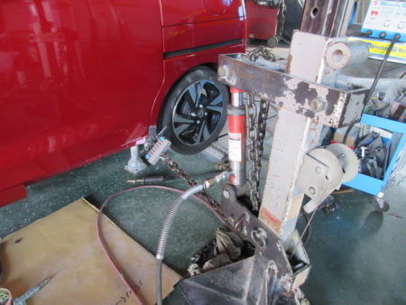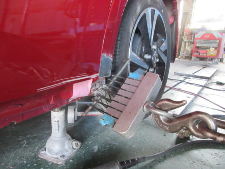 ▼ クオーターパネルの凹みはスタッド溶接でピンを溶接して専用の治具を取り付け、引き出して元の位置に修正をします。