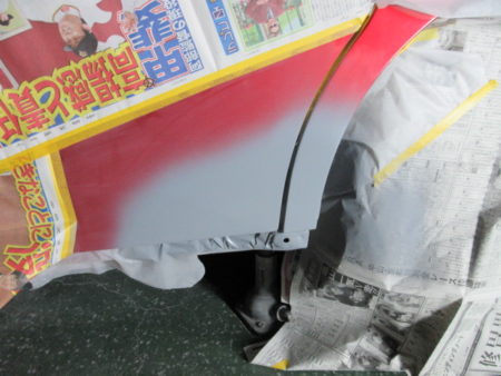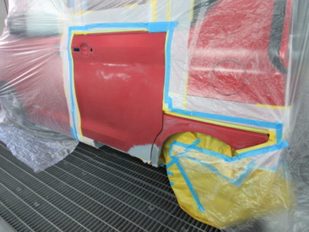▼ 塗装面の足付けと塗装面の油汚れやワックス分をしっかり落とす脱脂を行い、塗装面以外を塗料の飛散による汚れを防止する為に専用のシートでマスキングを行います。